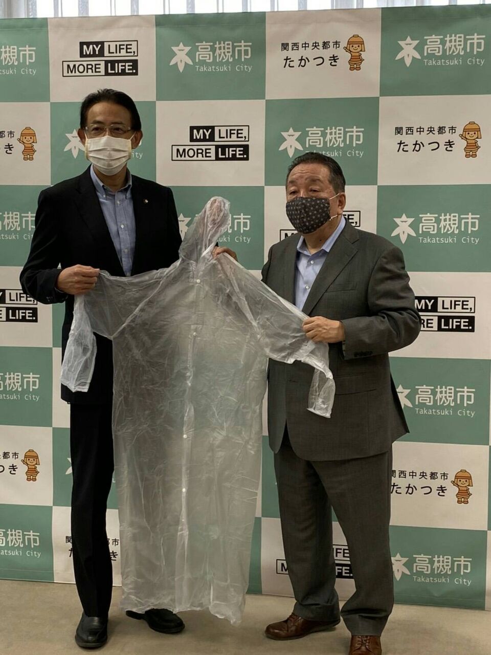 2020年5月13日、桑内義和実行委員長より濱田剛史高槻市長に高槻シティハーフマラソン実行委員会が所有するレインコート600着を新型コロナウイルス感染症対策に従事されている医療現場で使用してもらうよう、寄贈しました。